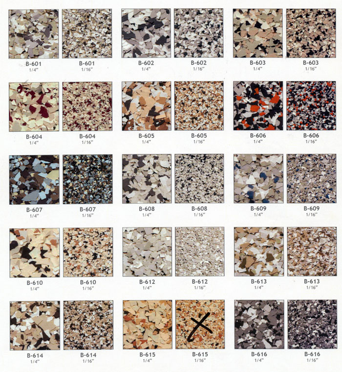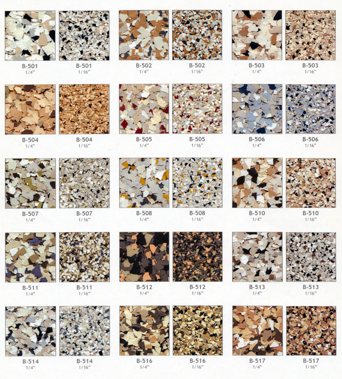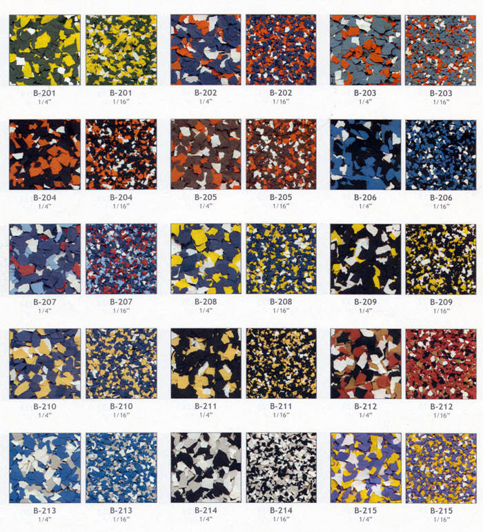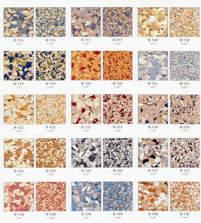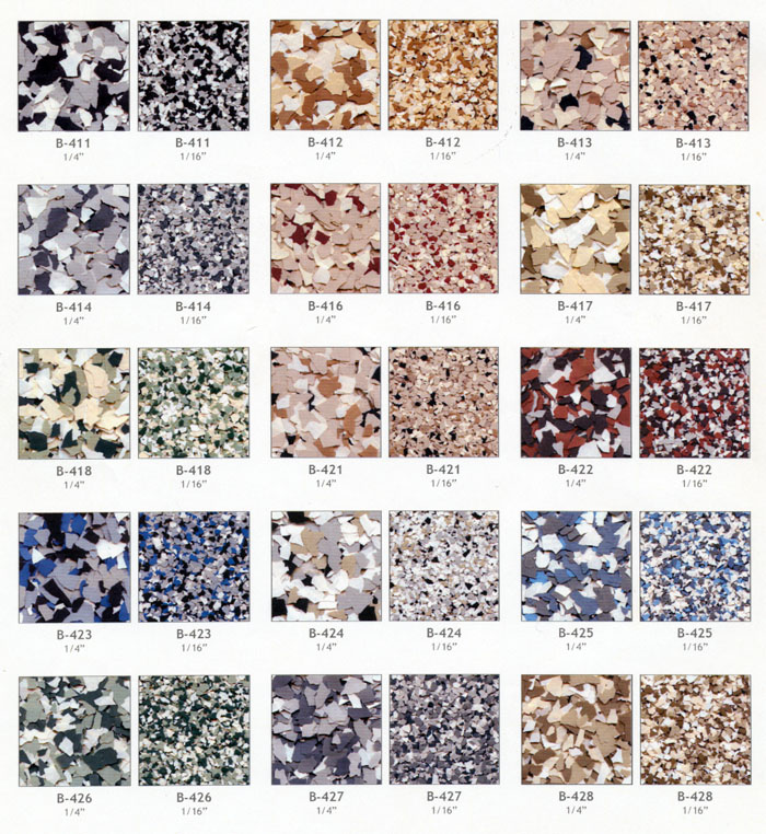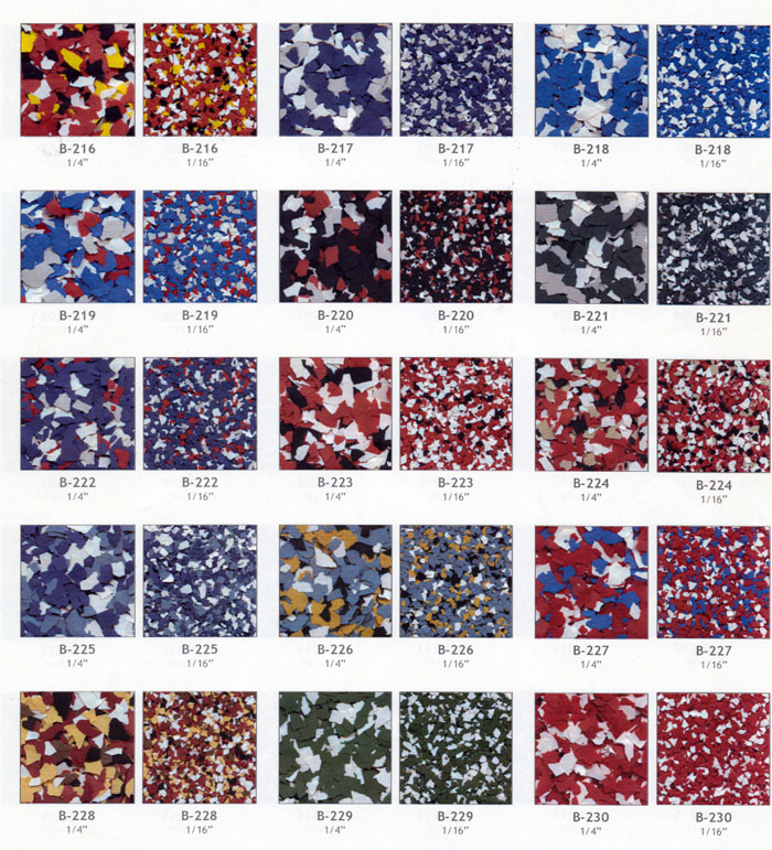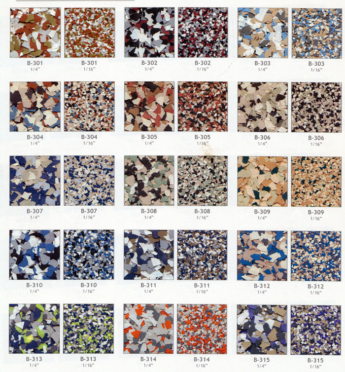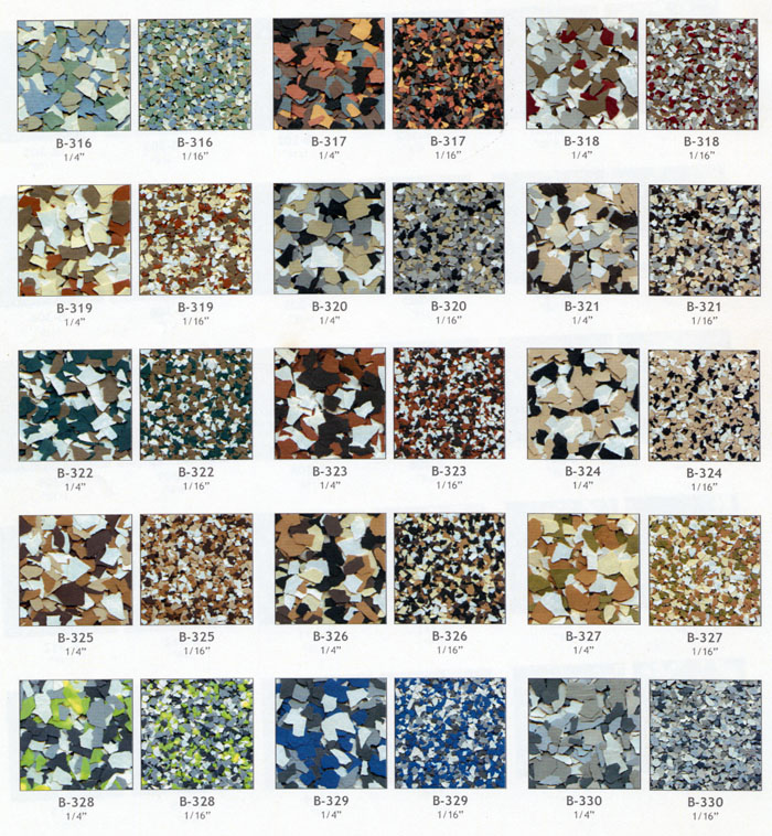 Color flake blends provide the ultimate color and texture solution for your next coating project. They are available in 6 different sizes 1", 1/2", 1/4", 1/8", 1/16", & 1/32".